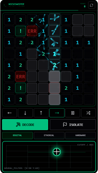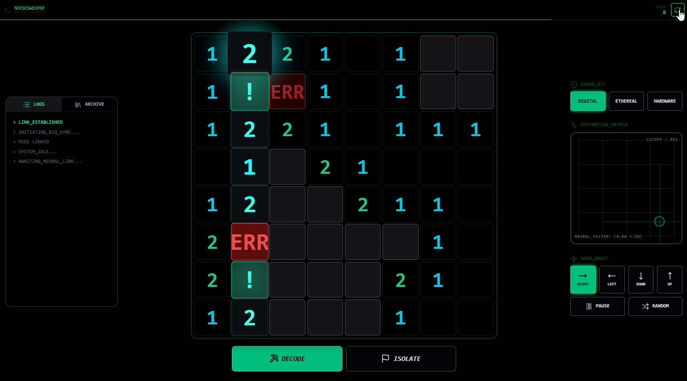 - AUDIO-REACTIVE PUZZLE: Based on Minesweeper logic. Revealing safe cells builds melodies; hitting mines triggers distortion and bit-crushing effects.
