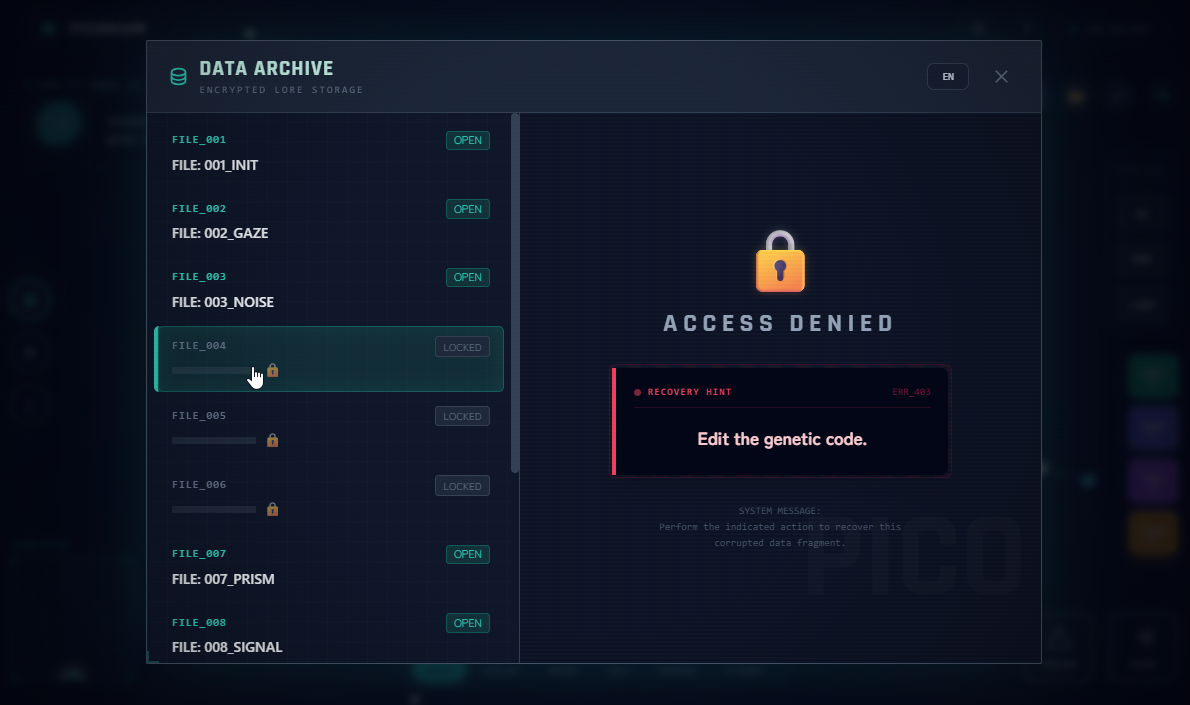 - Diegetic UI: Immerse yourself in the interface of a fictional research terminal.