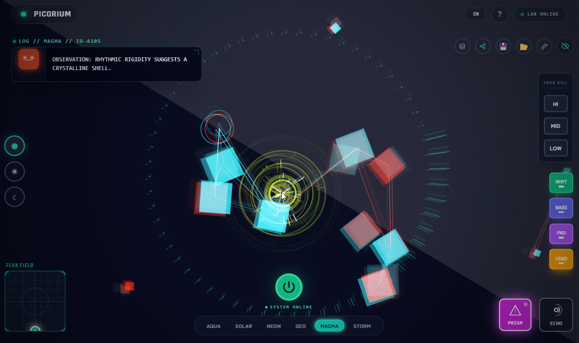 - The Genome System: Discover unique creatures ("Pico-Boids") with distinct shapes, colors, and personalities determined by their musical DNA.
